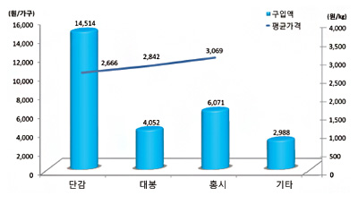 시장별 신선단감 구입단가를 살펴봤습니다. 전문점이 kg당 3,060원으로 가장 높게 나타났고, 대형마트가 3,036원, 전통시장 2,996원 순이었네요. 최근 구입비율이 늘어나고 있는 인터넷은 kg당 2,507원으로 전문점의 81.9%, 전통시장의 83.7%의 수준에서 구매되고 있는 것으로 나타났습니다.