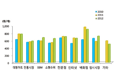 단감의 개수 별 가격 추이도 알아봤는데요. 2010~2012년, 3년간 구입처별 단감 가격추이에서 백화점이 가장 높은 가격을 보이고, 소형슈퍼는 조금씩 증가하는 모습을 보였습니다. 그 외 대부분의 구입처의 가격추이는 비슷한 형태가 유지됐습니다.