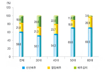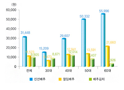 연령별 배추식품 구매액에서 신선배추는 60대가 55,996원으로 가장 비중이 높았고 50대가 50,332원으로 다음이었습니다. 30대의 구입액이 15.209원으로 평균구입액 31,448원보다 낮은 모습이었습니다. 절임배추 구입액에서도 50~60대가 각각 21,660원, 13,591원 이었습니다. 반면 30~40대의 배추김치 구입액은 각각 12,014원, 8,671원으로 높았고 60대의 배추김치 구입액은 2,926원으로 평균구입액 9,805원 보다 낮았습니다.