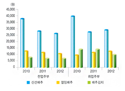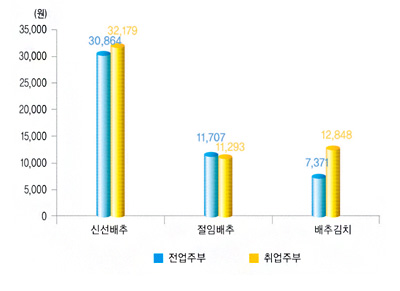 최근 3년간(2010~2012년)의 평균 구입액은 취업주주 56,320원, 전업주부 49,942원으로 취업주부의 구입액이 12.8% 높았습니다. 품목별로 취업주부의 구입액이 신선배추는 4.3%, 배추김치는 74.3% 높았지만 절임배추는 3.5% 낮게 나타났습니다.