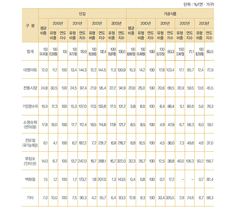 <표1> 연도별 구입처별 감식품 구입액 비중 분포