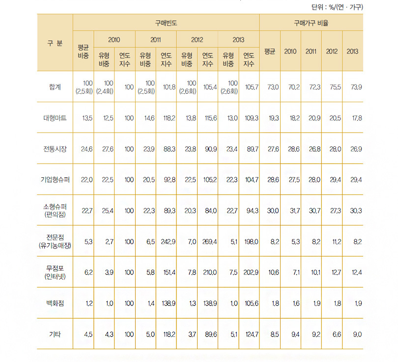 감 식품 구입액 비중 평균에서 전통시장은 24.8%로 가장 높은 비율을 보였습니다. 하지만 2010년 30.5%에서 2013년 22.2%로 점차 비중이 줄었습니다. 유기농매장이 포함된 전문점은 평균에서 6.1%의 낮은 비율이었지만, 2010년 4.1%의 비율에서 2012년 약간의 감소를 보였지만 2013년 6.9%로 비중이 증가한 모습이었습니다.