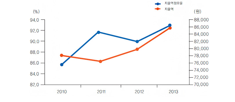 <그림1> 김치 선호 상위 20% 가구 지출액 및 점유율 추이