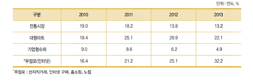 김치 구입처별 구입액 비율은 무점포(산지직거래, 인터넷 구매, 홈쇼핑, 노점) 23.81%, 대형마트 23.8%, 전통시장 16%의 순이었는데요. 최근 4년간(2010~2013년) 전통시장 비율이 줄어들고 무점포의 비율이 증가하는 모습을 보였습니다. 특히, 2010년과 비교해 2013년에는 비율이 2배 정도 늘어났습니다.