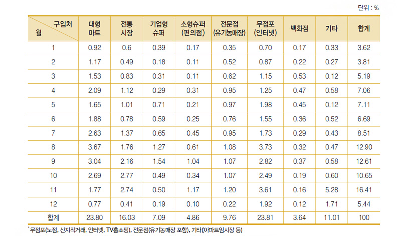 <표2> 김치 월별&구입처별 시장세분화 구입액 비율 (2010~2013)