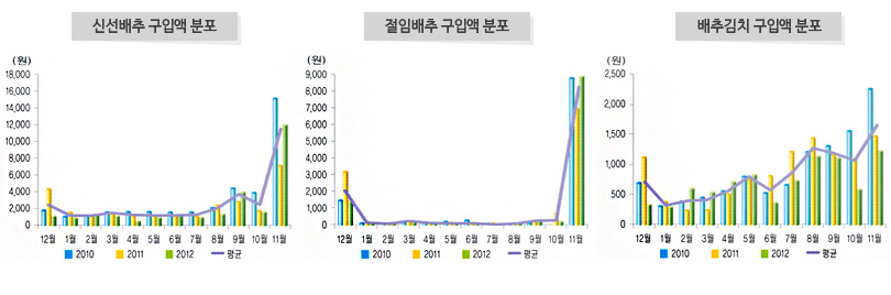 신선배추의 3년간(2010~2012년) 월별 구매패턴을 살펴봤습니다. 김장철인 11월과 추석이 포함된 9월의 구입액이 높게 나타나고, 1~7월은 낮았습니다. 구입액 비중은 11월이 37.7%, 9월 12.2%, 6~7월 4.4%, 1·2·5월 3.9%, 4월 3.8%의 순이었습니다.