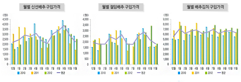 <그림2> 월별 신선배추 구입가격 / 월별 절임배추 구입가격 / 월별 배추김치 구입가격