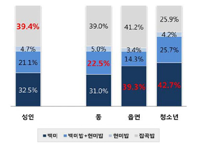밥의 형태와 잡곡의 선호도에 대해서도 물어봤습니다. 과거 백미밥이 부의 상징이었던 것과 달리 요새는 건강을 위해 잡곡밥을 꼭 챙겨먹는 가구가 늘어나고 있죠. 응답가구의 39.4%는 평소에 잡곡밥을 즐긴다고 답했고, 백미와 현미를 함께 먹는다는 응답도 21.1%였어요. 읍면지역에서는 백미밥의 선호도가 높았고, 동지역에서는 백미와 현미를 섞어먹는다는 비중이 높았답니다. 청소년들의 잡곡 선호도를 살펴보니 흰쌀밥, 잡곡밥, 현미밥 순이어요.