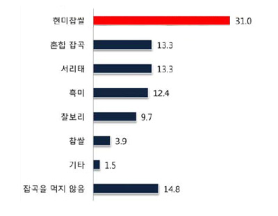 다른 가구들의 잡곡을 구입하는 형태에 대해서도 알아볼까요? 가장 많이 구입하는 잡곡은 현미찹쌀이고, 혼합잡곡, 서리태, 흑미, 찰보리, 찹쌀 순으로 인기가 있다는 사실을 볼 수 있네요. 잡곡을 전혀 먹지 않는다는 응답도 14.8%에 이르렀는데, 몸에 좋은 잡곡 한, 두 가지를 섞어먹는 습관을 가지면 어떨까요?