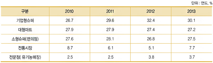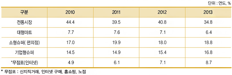 4년 평균(2010~2013년) 무 가공식품의 구입처별 구입액 비율은 기업형슈퍼 29.6%, 대형마트 27.6%, 소형슈퍼 27.5% 등의 순이었습니다. 신선한 무와 달리 전통시장의 비율이 줄어들고 기업형 슈퍼와 대형마트의 비중이 늘고 있습니다.