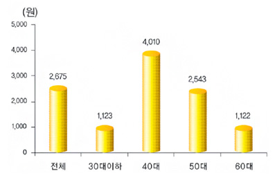 양파 가공식품은 40대가 4,010원으로 구입액이 가장 많았습니다. 다음으로 50대 2,543원, 60대 1,122원 순이었고, 30대는 1,123원으로 신선양파 구입액에 이어 가장 낮은 비중을 보였습니다.