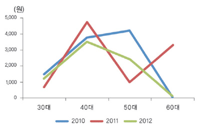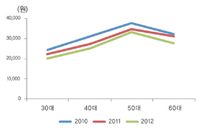 가공식품 구입액은 30~50대에서 2010~2011년 감소했다가 2011~2012년 증가했습니다. 40대의 가공식품 구입액은 2010~2011년 3,762원에서 4,752원으로 증가했다가 2011~2012년에 3,516원으로 감소하는 추세였습니다.