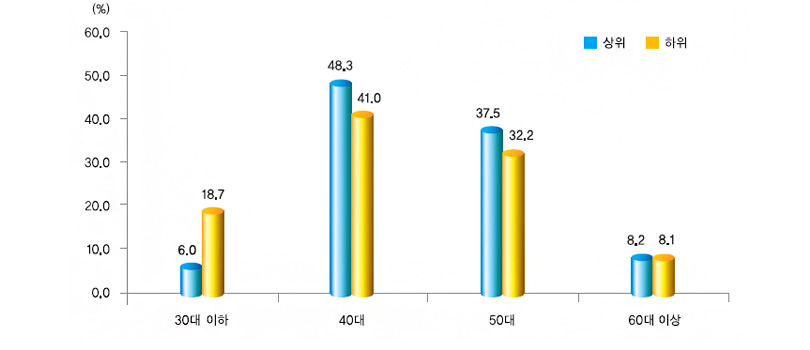 사과식품 선호 상위 20% 가구에서 40~50대 연령층의 비율이 높게 나타났고 하위 80% 가구에서는 30대 이하 연령층 비율이 높았습니다. 연령별 비율을 살펴보면, 사과선호 상위 20% 가구에서 40대가 48.3%로 가장 비중이 많았고, 50대가 37.5%로 그 다음이었습니다.