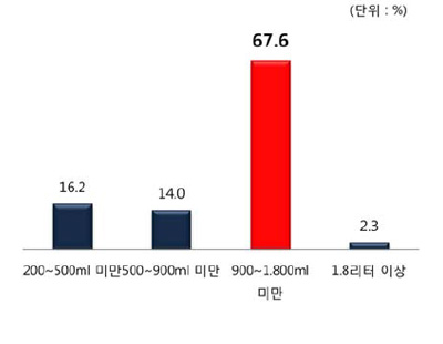 계란의 경우 2주에 1회(29.9%)의 구입 비중이 가장 높은 것으로 나타났는데요. 우유와 요구르트의 경우 주 1회 이상의 비중이 높게 나타난 반면, 계란의 구입주기는 2주 단위가 가장 높은 것으로 나타났어요. 이는 구입 단위에서 그 이유를 찾아볼 수 있습니다. 보통 계란을 살 때 한 알, 두 알의 단위로 사지 않잖아요. 대부분 계란은 한판인 30개 단위로 많이 구입하게 됩니다. 실제로 그 비율을 살펴보았더니, 30개(한판) 단위 구입이 66.3%로 절반을 훌쩍 뛰어넘는 것으로 나타났네요. 다음으론 10개 단위로 구입하는 비율인 14.5%이구요. 다음으로 우유의 구입 단위는 어떨까요? 900ml 이상 1.8ml 미만이 67.6%로 압도적으로 높은 모습을 보이고 있습니다.