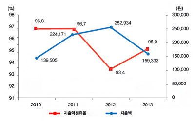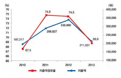 <그림2> 건고추 및 분쇄 선호 상위 20% 가구 지출액 및 점유율 추이