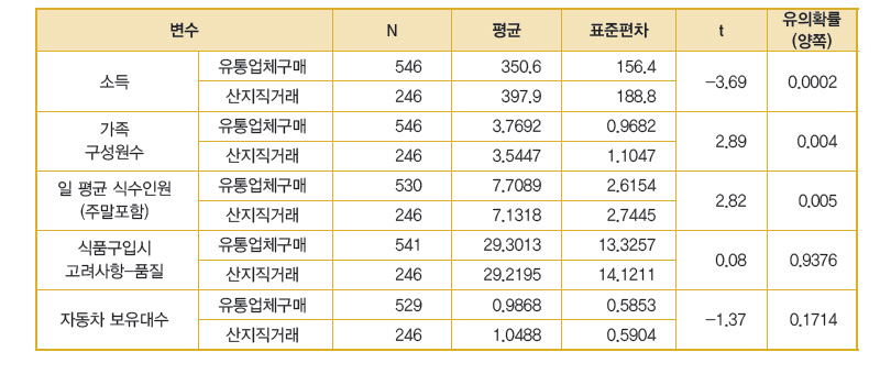 <표1> 산지직거래 구매가구와 유통업체 구매가구의 특징분석 t-test(2012~2013)