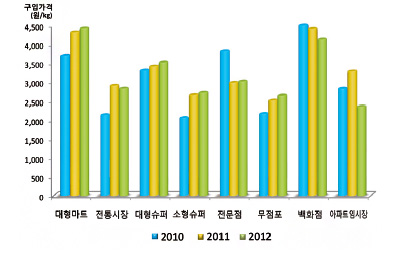 국내산 감귤과 수입 오렌지의 3년간(2010~2012년) 구입처별 구입액 및 구입가격을 살펴봤습니다. 국내산 신선감귤의 구입액 비중은 평균적으로 전통시장의 비율이 높았지만 2010년도 24.8%에서 2012년 15.4%로 감소하는 추세네요. 반면 대형슈퍼는 2010년 14.4%에서 2012년 18.1%로 증가하는 모습을 보였고, 2012년도의 구입액 비중에서는 대형슈퍼가 좀 더 높은 비중을 차지했네요. 감귤의 구입가격 패턴은 대체로 유사한 패턴을 보이고 2012년도에 대형마트 가격이 백화점 구입가격보다 높아진 것이 특징이네요.