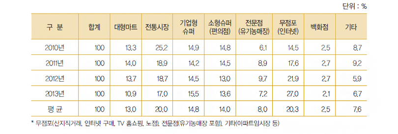 <표1> 신선사과 주요 구입처별 구입액 비중 추이