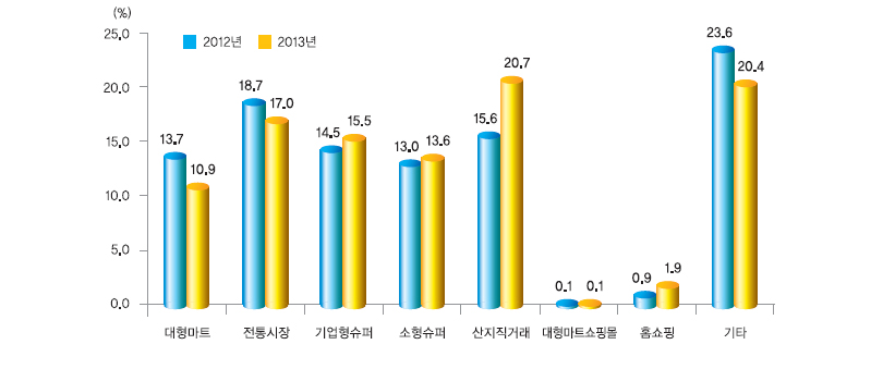 신선사과 구매 중 무점포 시장이 성장한 원동력은 직거래 덕분이었습니다. 직거래는 산지직거래, 대형마트, 쇼핑몰, TV 홈쇼핑 등이었고 특히 산지직거래 구입액이 크게 증가한 것으로 구입액 비율은 2012년 15.6%에서 2013년 20.7%로 늘어났습니다. 또한 명절에도 산지직거래가 늘어난 것은 산지에서 택배로 배달하는 경우가 증가했기 때문입니다.