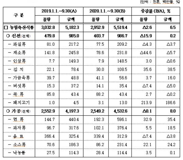 농림축산식품부(장관 김현수, 이하 ‘농식품부’)는 2020년 3분기 누계 기준(잠정) 농식품 수출액이 전년동기 대비 6.5% 증가한 55억 1900만불을 기록했다고 밝혔다.