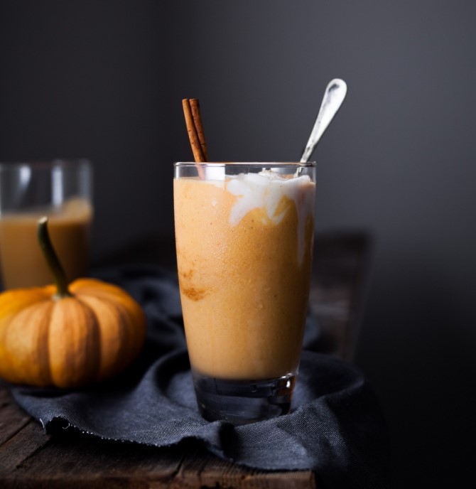 재료 : 저지방 요거트 160㎖, 오렌지 1/2개, 단호박 100g, 바나나 1개, 시나몬 가루 1/4티스푼, 육두구 약간, 얼음 1컵