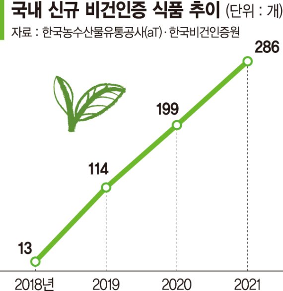 비건(채식주의)이 소비문화의 트렌드로 떠오르면서 국내 식품시장에서 비건인증 제품이 대폭 늘었다. 전 세계적으로 비건 식품시장의 성장이 예상되면서 대기업의 참여가 늘어나고 시장이 활기를 띠는 모습이다.