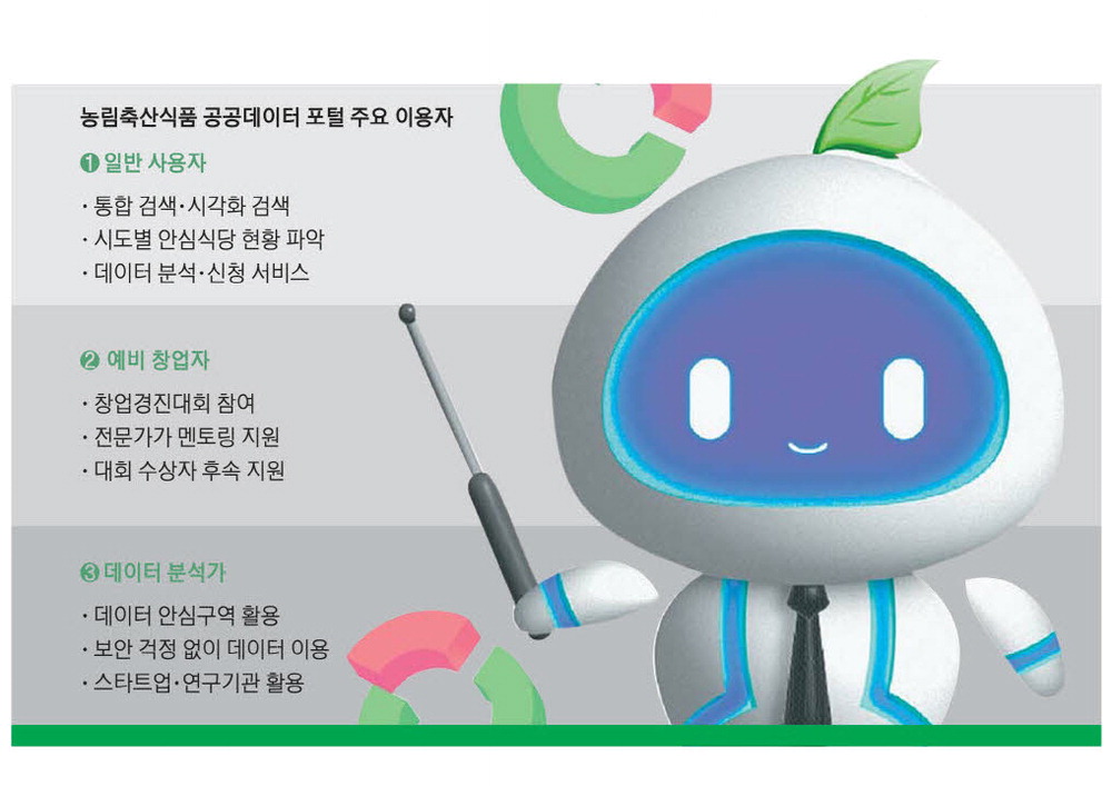 농식품 공공데이터 포털에서 제공하고 있는 서비스 중에 눈길을 끄는 것 중 하나는 '데이터 안심구역'이다. 말 그대로 데이터를 안전하게 분석·활용할 수 있는 구역을 뜻하는 서비스로, 이 구역에서는 미개방 데이터가 외부로 유출되지 않게 통제된 환경 안에서 접근할 수 있도록 허용하고 있다. 즉 데이터 제공 기관이 보안·프라이버시·저작권 등을 이유로 외부 공개에 제약을 두고 있는 데이터에 대해 이 구역 안에서는 승인된 사용자에 한해 가상 환경 내에서 쓸 수 있도록 하는 방식이다. 박경희 농식품부 빅데이터전략팀장은 "데이터 안심구역으로 지정된 곳에서는 신청 절차를 통해 외부로 공개하기 어려운 고가치 공공데이터를 활용할 수 있어 대학과 연구기관, 스타트업 등에서 다양하고 깊이 있는 연구와 서비스 개발이 가능하다"고 말했다.