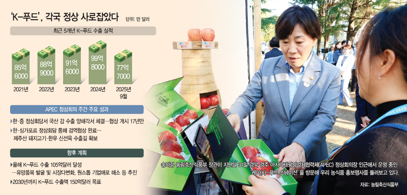 농식품부는 이번 APEC 성과가 K-푸드 수출 호조세를 유지하는 데 일조할 것으로 보고 있다. 올해 K-푸드 수출실적은 지난 3분기 기준 77억7000만 달러(한화 약 11조885억원)로 전년 동기 대비 6.3% 증가했다. 이는 지난 2020년 한 해 K-푸드 수출실적 75억7000만 달러(10조8016억원)를 웃도는 수준이다.