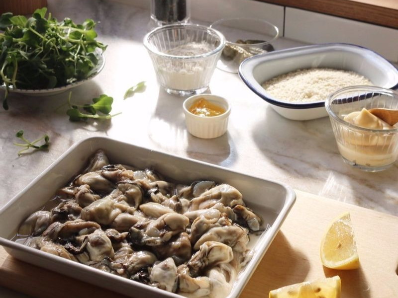 [우리의 식탁 제공]생굴 200g, 밀가루 1/2컵, 빵가루 1컵, 달걀 1개, 파슬리가루 1큰술, 식용유 적당량, 맛술 1큰술, 레몬 반조각, 후추 약간