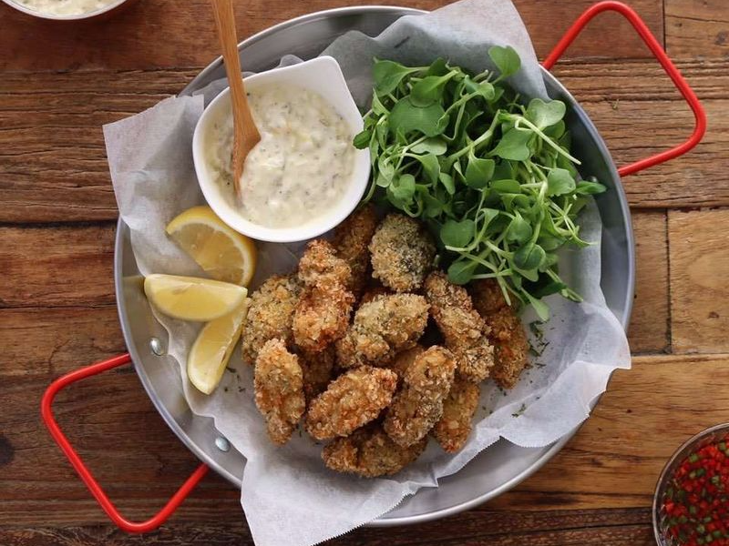 타르타르 소스를 곁들인 굴 튀김 요리는 캠핑 메뉴로 활용해도 좋습니다. 여름휴가 시 캠핑장에서 시도해 볼만 합니다.