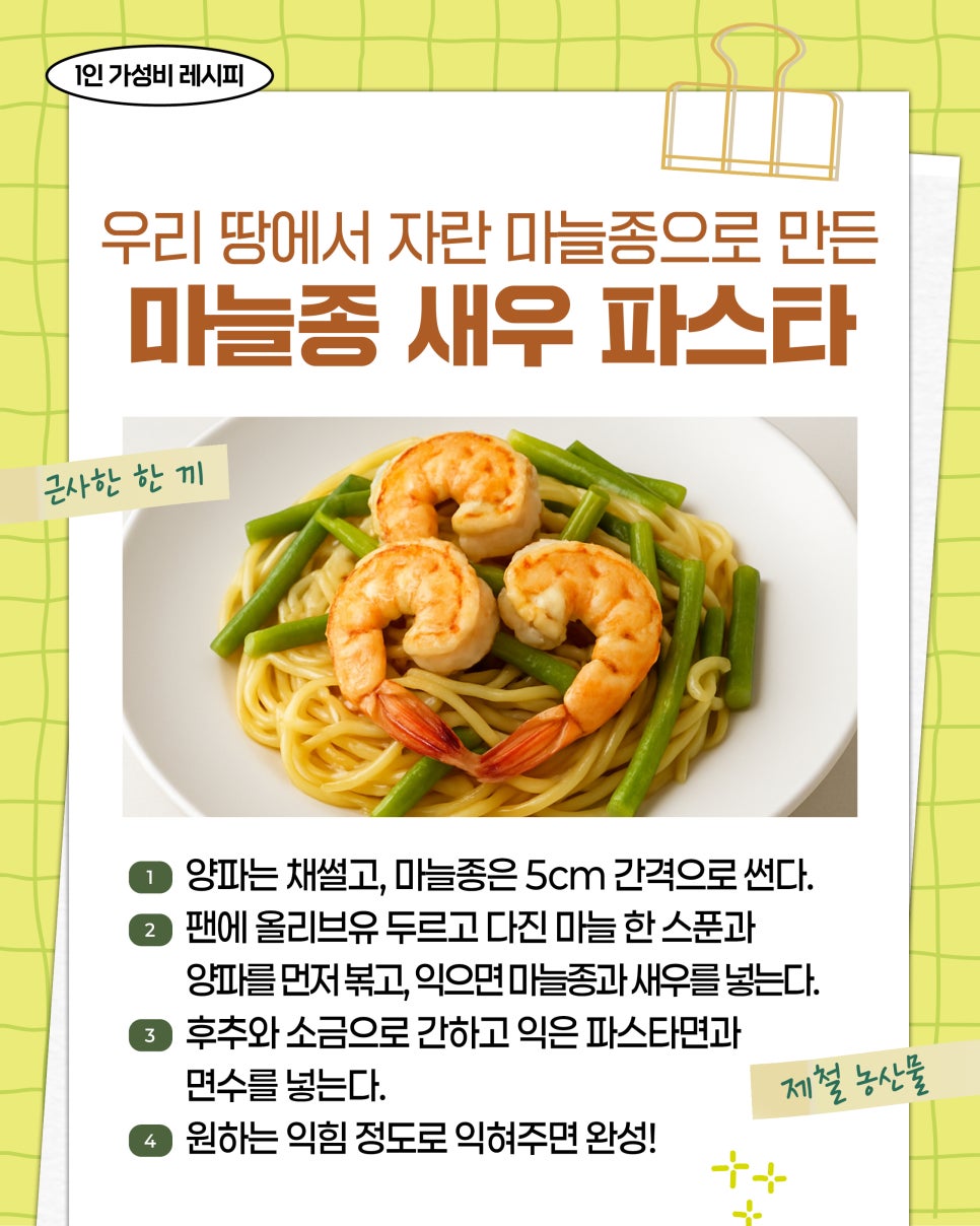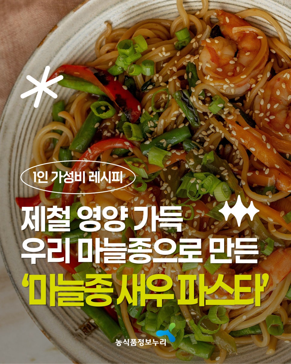 #농식품정보누리 #1인 #가성비 #레시피 #마늘종 #새우 #파스타 #레시피 #양파 #마늘