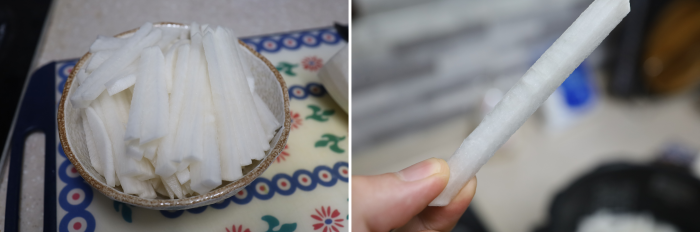 무는 너무 얇지 않게 채를 썰어 준비해 주세요.