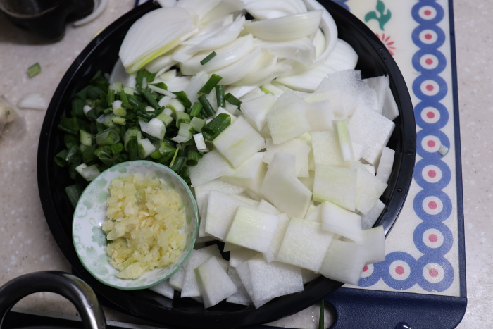 무는 얇고 네모난 모양으로 썰고, 쪽파와 양파, 다진 마늘도 준비해 주세요.