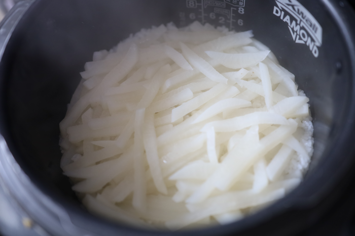 씻어둔 쌀 위에 채 썬 무를 얹어 취사 버튼만 누르면