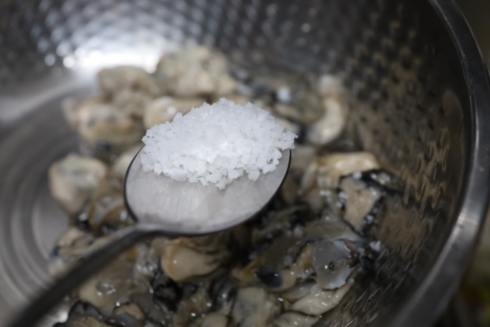 먼저 굴에 소금 한 스푼을 넣고 살살 흔들어 세척해 주세요.