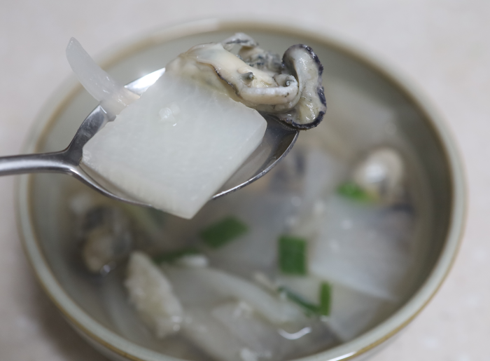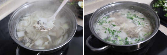 국이 끓어오르고 무가 익었다면 굴과 쪽파를 넣고 더 끓여줍니다.